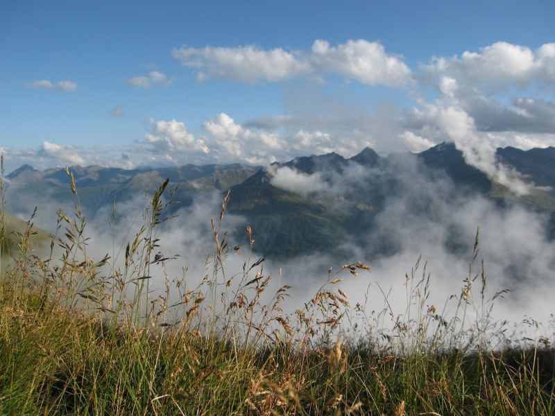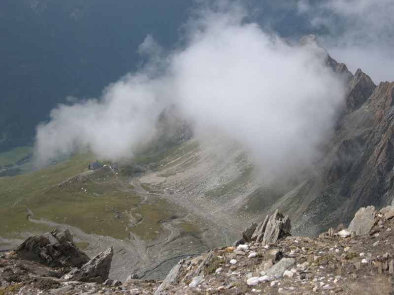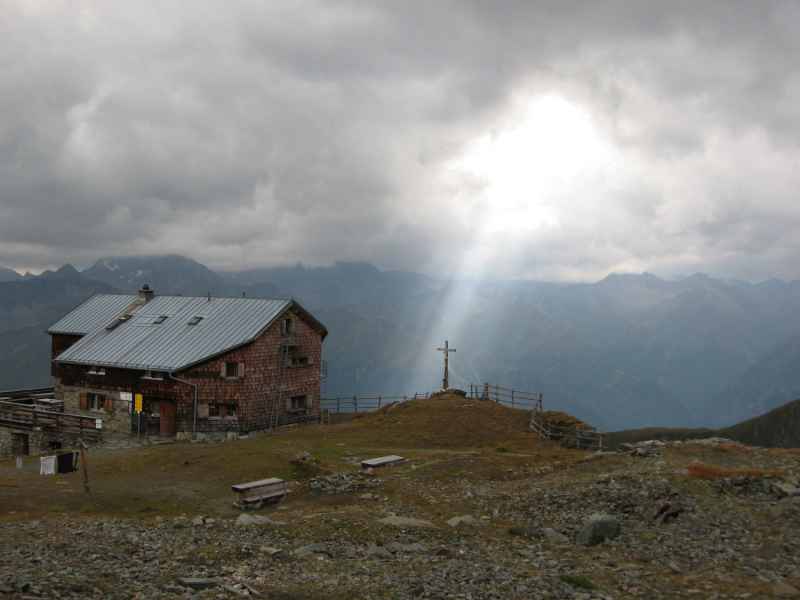 Das Wetter hält und zusammen mit den dahin ziehenden Wolken und dem ständigen Wechsel der Lichtverhältnisse entsteht eine tolle geheimnisvolle Atmosphäre. Auf dem Weg hinab treffen wir das zehnte Mitglied unserer Gruppe. Armin und Heidrun, die am Vortage von ihm in Mitternsill vom Bahnhof abgeholt wurde, kommen uns entgegen. Nun ist unsere Wandergemeinschaft komplett. Armin jedoch wird uns am späten Nachmittag wohl mit schwerem Herzen wieder verlassen. Gemeinsam erreichen wir gegen 14:00 Uhr die Johannishütte in einer Höhe von 2.121 Metern.