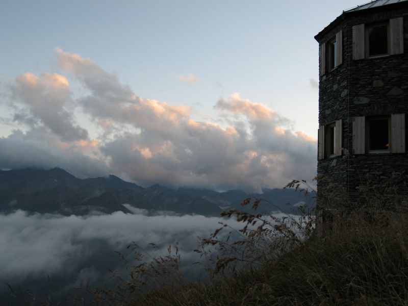 Bei leichtem Regen starten wir heute, nicht sehr nass, aber kalt. Aber auch dieser Tag hält einige schöne Momente für uns bereit. So treffen wir auf unserem ersten Teilstück des Venediger Höhenweges auf eine große Gruppe von Gämsen. Die Bonn-Matreier-Hütte ist das Ziel dieser Etappe. Sie ist eine Alpenvereinshütte des Österreichischen Alpenvereins und des Deutschen Alpenvereins in der Venedigergruppe. Die Hütte liegt im Nordwesten der Gemeinde Virgen. Von 1884 bis 1887 wurde in Südtirol die Bonner Hütte gebaut, welche 1919 von Italien enteignet wurde. Als Ersatz für die verlorene Hütte in Südtirol errichtete die Sektion Bonn des Deutschen Alpenvereins gemeinsam mit der Sektion Matrei des Österreichischen Alpenvereins, die wegen der damaligen schlechten wirtschaftlichen Situation einen Partner suchte, 1931/32 die Bonn-Matreier-Hütte. Sie konnte am 14. August 1932 ihrer Bestimmung übergeben werden. Dies ist die bislang einzige deutsch-österreichische Hüttengemeinschaft, die über alle Wirren der Zeit Bestand gehabt hat. Unterhalb der Sajatköpfe steigen wir zum Talboden des Timmeltals hinab. An sich ist es ein schöner Weg, doch leider fehlt uns die Sicht. Der Ausblick von hier oben sollte eigentlich eine tolle Aussicht auf das Virgental und den Lasörlingkamm gegenüber bieten. Vom Eselsrücken aus können wir schon die Bonn-Matreier-Hütte ausmachen, aber der Blick täuscht. Es geht erst noch einmal steil herunter und dann wieder hinauf.