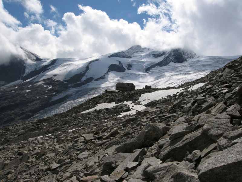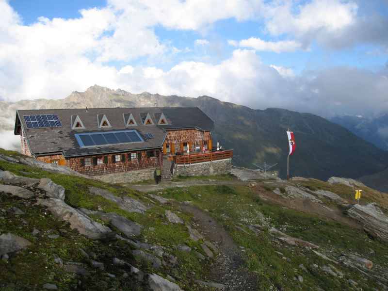 Den Vormittag, wettertechnisch nun doch besser als erwartet, nutzen wir zum Trocknen unserer Sachen und zum Genießen der wärmenden Sonne. Die Neue Prager Hütte liegt auf 2.796 Metern Meereshöhe südöstlich des Großvenedigers. Sie wurde in den Jahren 1901/03 unter maßgeblicher Beteiligung von Johann Stüdl aus Prag errichtet und am 9. August 1904 feierlich eingeweiht. 2004 feierte die Hütte ihr 100-jähriges Bestehen.