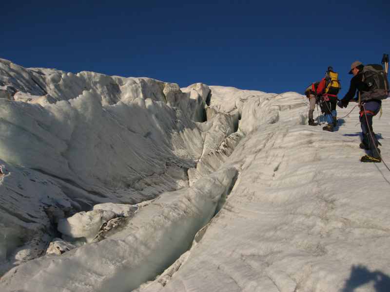 Über grobes Blockwerk erreichen wir schon nach kurzer Zeit die ersten Schneefelder. Am Horizont geht nun die Sonne auf. Er erhebender Augenblick. Schnell erobert sich der junge Morgen das Terrain. Im beginnenden Licht des neuen Tages legen wir die Steigeisen an und binden uns zu einer Seilschaft zusammen. Ernst gibt noch einige Anweisungen und Tipps und dann geht es los.