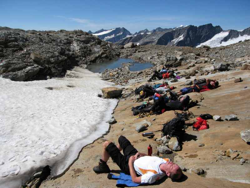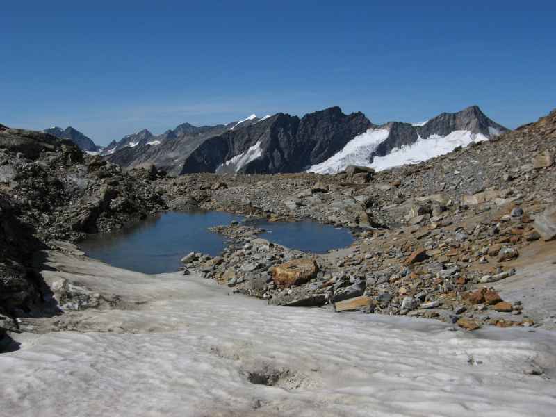 An einem Gletscherteich verabschiedet Ernst sich von uns und macht sich auf den Heimweg. Wir selbst machen eine ausgiebige Pause, ehe auch wir Sieben uns auf den Weg zum Defreggerhaus machen.