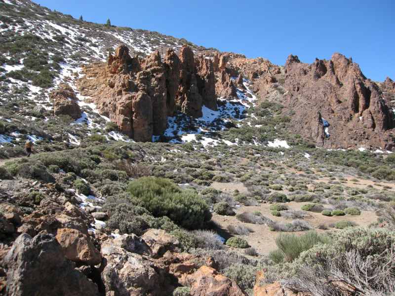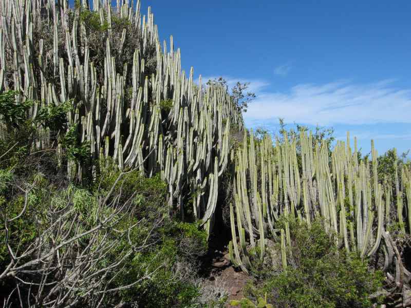 Beeindruckend ist der Blick in den tiefen und unzugänglichen Barranco de los Cochino. Hier hinein führt kein Wanderweg. Am unserem weiteren Weg stehen schöne Exemplare des Teide Natternkopfs, eine der außergewöhnlichsten und interessantesten Pflanzen der Welt. Die riesigen Blütendolden bieten vielen Insekten Nahrung. Zurück führt der Weg nun durch den „Barranco de Blas“. Immer wieder grüßt zu unserer Rechten der Teide mit seiner Schneehaube. Beim Abstieg in Richtung Los Silos sehen wir große Ansammlungen von Kakteen. Hierbei handelt es sich um den kräftigen Dillenius-Feigenkaktus. Die zwischen einem und drei Meter hohen Sträucher tragen an ihren jungen Trieben sehr spitze Dornen. Sie können eine Länge von sieben Zentimeter erreichen und können und die menschliche Haut problemlos durchstechen.