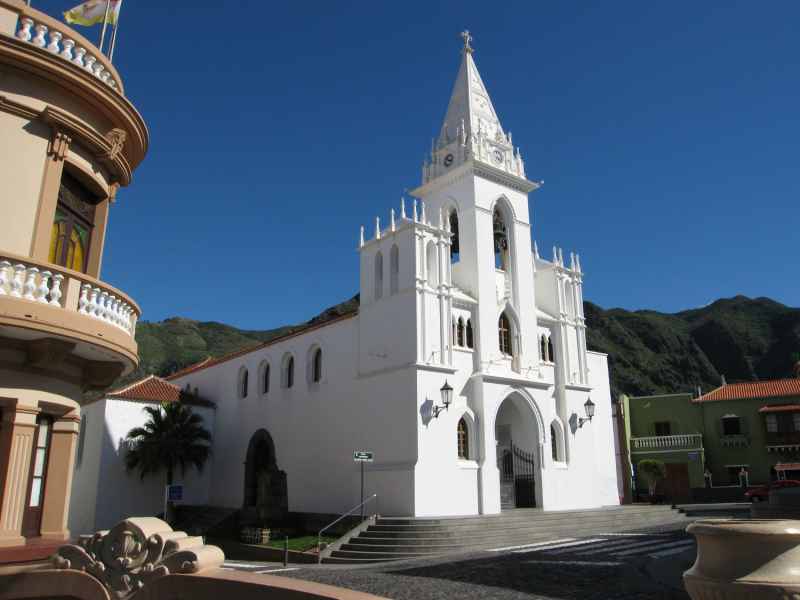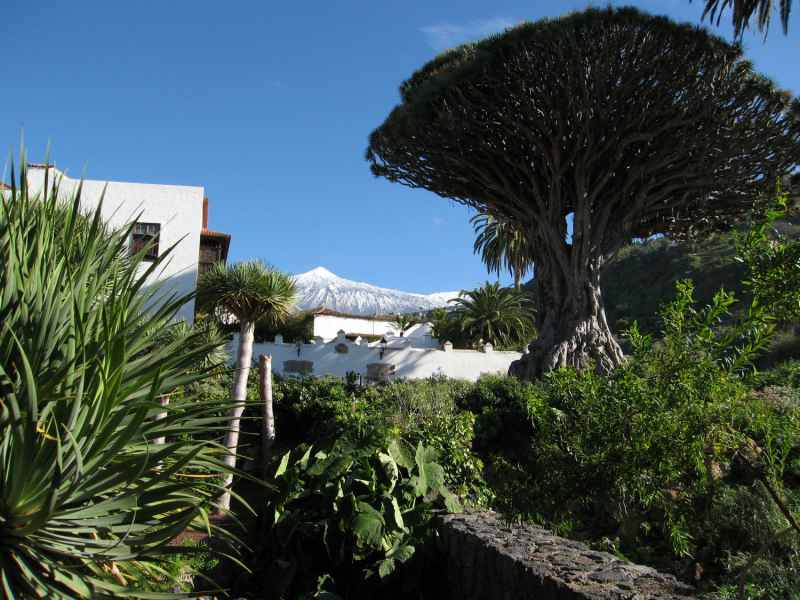 Zurück in Los Silos genießen wir noch die schöne Architektur der Kirche und die beschauliche Atmosphäre des Ortes. Bevor wir zu unserem Hotel nach Puerto de la Cruz zurückkehren machen wir noch einen Abstecher nach Icod de los Vinos. Icod de los Vinos ist bekannt für den in der Gegend angebauten qualitativ hochwertigen Wein. Hier möchten wir uns ein Wahrzeichen Teneriffas, den “Drago Milenaro”, den tausendjährigen Drachenbaum, ansehen. Von Botanikern wurde sein Alter jedoch auf etwa 400-600 Jahre bestimmt. Die Altersbestimmung ist daher so schwierig weil die Pflanze kein eigentlicher Baum mit Jahresringen ist, sondern ein großes Liliengewächs. Dennoch gehört dieser “Baum” zu den ältesten Lebewesen auf der Welt. Es handelt sich um eine endemische, d.h. nur auf den Kanaren lebende Art. Er steht seit 1917 unter Naturschutz und ist eines der Wahrzeichen der Insel. Sein Stammdurchmesser liegt bei fast 20 m und die Höhe wird mit 17 m angegeben. Wenn der Baum eingeschnitten wird, so fließt ein Saft heraus, der eine blutrote Farbe annimmt und als “Drachenblut” bezeichnet wurde. Daher war dieser Baum für die Ureinwohner ein magisches Gewächs, der auch in der Medizin einen wichtigen Beitrag leistete.