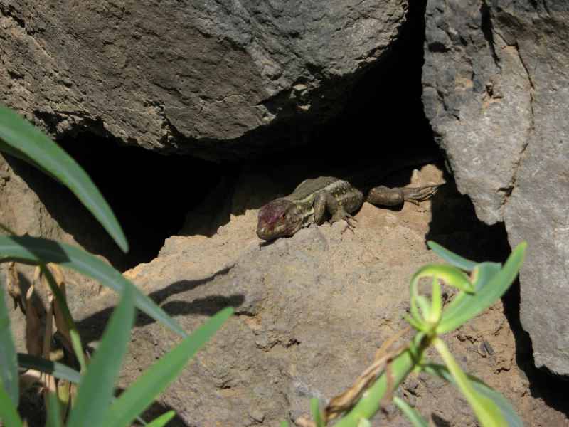 Im Bereich der Steilküsten haben wir immer wieder Gelegenheit Turmfalken zu beobachten. Am Weg sehen wir die ersten Bananenplantagen. An und für sich ist die Banane keine einheimische Pflanze. Vielmehr wird sie unter hohen technischen Aufwand hier angebaut. Links und rechts des Weges raschelt es ständig und nach wenigen Metern sehen wir auch die Verursacher – es sind Vertreter der Westkanareneidechsen. Die Männchen zeigen eine auffällige Färbung mit blaugrünen Anteilen, während die Weibchen eher graubraun bis rotbraun erscheinen.