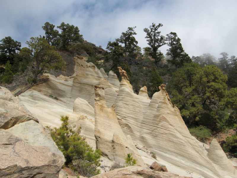 Weiter geht es nun über Lavastein eingefasste Wege immer weiter hinauf. Und dann erreichen wir sie – die weiße Mondlandschaft von Villaflor. Von hier hat man einen freien Blick auf die wunderbaren Tuffsteinsäulen, die tief unten im Barranco de las Arenas zu bestaunen sind. Tief verborgen im hellgrünen Kiefernwald liegt die weiße Mondlandschaft von Vilaflor, die zu einer der bemerkenswertesten Naturattraktionen des Südens gehört. Ein zauberhaftes Gemisch aus vulkanischer Kraft, Wind und Wasser erschuf hier vor etwa 500.000 Jahren eine anmutige Landschaft aus hellen Bimssteinkegeln, die an fantasievolle Sandsteinschlösser erinnern. Inzwischen ist es nur noch gestattet, dieses fragile und äußerst erosionsanfällige Meisterwerk der Natur aus der Ferne zu betrachten. Ein Betreten durch Wanderer, so wie wir es oftmals beobachten können, ist nicht gestattet und verbietet sich eigentlich von selbst.