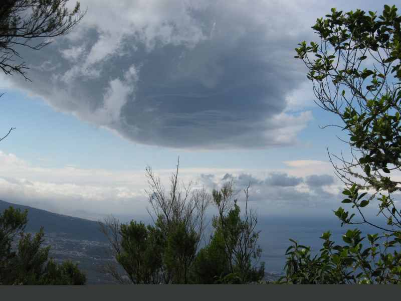Der Teide in der Ferne schmückt sich mit einem Sombrero. Ein nahendes Unwetter kündigt sich an.
