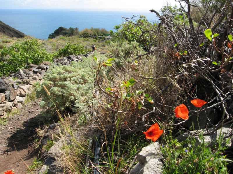 Die hier bestellten Ackerflächen lassen darauf schließen. dass es zumindest noch zeitweise bewirtschaftet wird. Jenseits der mühevoll angelegten Natursteinmauern gedeihen zahlreiche Mandelbäume. Aus ihren Früchten wird die traditionelle Mandelspeise „bienmesabe" – zu Deutsch „.schmeckt mir gut" - eine Mandel-Honig-Paste, hergestellt, die bei den Einheimischen auch heute noch sehr beliebt ist. Allerdings findet die Mandelernte auf Teneriffa nur noch in der Region um Santiago dei Teide besondere Beachtung.
