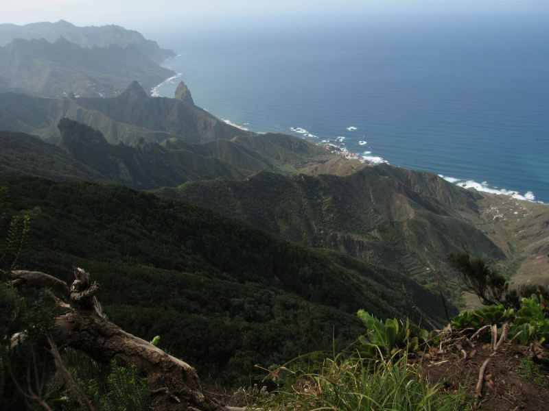 Zurück in Charmorga steigen wir wieder in den Wagen und fahren ein paar Kilometer zurück in das Inselinnere. Wir möchten nämlich noch dem Lorbeerwald bei Ensillada einen Besuch abstatten. Dieser Waldtyp ist eine auf die Kanarischen Inseln beschränkte Reliktvegetation und zeigt, wie die Flora vor 20 Mio. Jahren im Mittelmeerraum ausgesehen haben mag. Nach ein paar Höhenmetern hinauf zum Chinobre auf 910 Metern Höhe können wir eine grandiose Aussicht über das Anaga-Gebirge genießen. Mit Recht wird diese Aussicht als ein Highlight in unserem Wanderführer beschrieben.