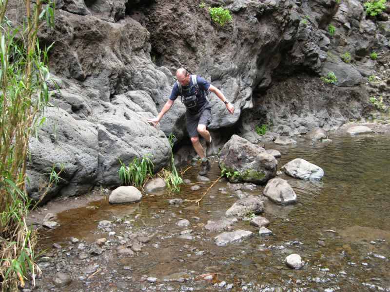 Gleich zu Beginn der Tour wird uns schon ein hohes Maß an Aufmerksamkeit abverlangt, denn das Gelände ist abschüssig und rutschig. Auf dem etwa 20-minütigen Abstieg in den ganzjährig wasserführenden Barranco halten wir uns stets auf dem deutlichen Hauptpfad. Senkrecht türmen sich die Basaltwände neben uns auf und springen zuweilen bedrohlich nach vorne. Auch auf dem weiteren Weg halten wir immer wieder inne, um die Vielgestaltigkeit des Gesteins und die interessante Pflanzenwelt anzuschauen.