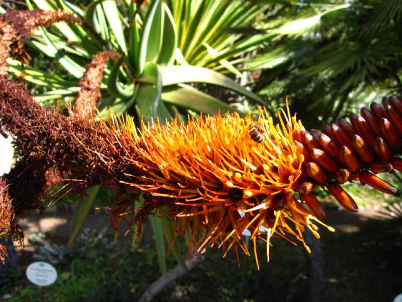 Bei schönstem Sonnenschein und sehr angenehmen Temperaturen wandern wir von Los Silos in südlicher Richtung dem Barranco de Bucaron entgegen. Die Pflanzenvielfalt lässt uns wieder staunen. Hier sehen wir Exemplare der Kanaren-Wolfsmilch. Auch finden wir wieder die uns schon bekannten Wasserröhren. Beeindruckend wie einfach und effektiv die Wasserversorgung der Insel gewährleistet wird. Die Vegetation wird immer artenreicher. Neben uns schon bekannten Pflanzen säumen amerikanische Agaven den Weg. Sie wachsen vielerorts auf Teneriffa und den anderen Kanarischen Inseln. Wie der Name es bereits vermuten lässt, stammen diese Pflanzen aus Amerika. Am Boden bilden sie bis zu 1,5 Meter hohe, ausladende Rosetten, aus denen die langen, spitzen und sehr fleischigen Blätter ragen. Sie können mehr als 1,5 Meter lang werden. Weithin sichtbar sind die mitunter über drei Meter hoch aufragenden Blütenstände. Auf den sehr dicken Stängeln sitzen mehrere Blüten.