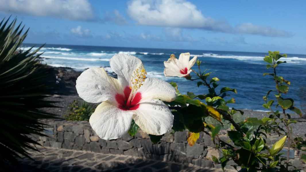 Wir beginnen unsere erste Eingehtour am Strand von Puerto de la Cruz. Von hier wollen wir immer in Nähe der Küste in Richtung Cuesta de la Villa wandern. Zunächst schauen wir uns noch ein wenig am Strand um bevor wir dann den höheren Lagen von Puerto de la Cruz entgegen streben. Über viele Treppen gelangen wir 100 Meter oberhalb des Meeres. In La Paz sind schöne kleinere Gebäude mit gepflegten Gärten errichtet worden. Hier finden wir auch, ganz in der Nähe der „Calle de Agatha Christie“ eine charakteristische Pflanze Teneriffas vor – den afrikanischen Tulpenbaum. Der Blick in die Tiefe auf den Atlantik fasziniert uns immer wieder. Die tosende Brandung bricht an den scharfen Klippen des Vulkangesteins.