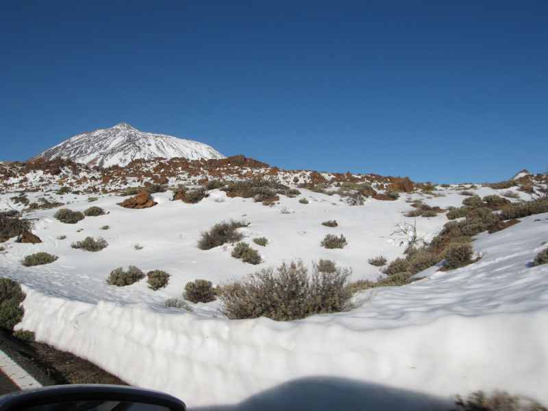 Nun machen wir uns auf einer anderen Route wieder auf den Heimweg. Ein spannender Tag mit interessanten Blicken unter recht widrigen Wetterverhältnissen geht nun zu Ende. In der Ferne erkennen wir die Sternwarte des Mount Teide. Die klare Aussicht und der kaum vorhandene Lichteinfluss menschlicher Siedlungen haben den Teide zum bevorzugten Gebiet für die Sternwarte gemacht.