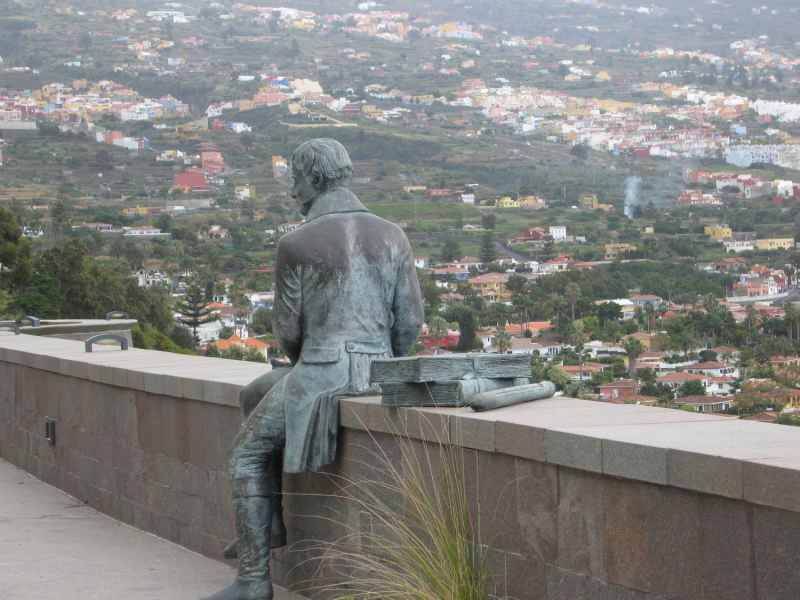 Der heutige Tag führt uns zu Fuß in das grüne und fruchtbare Orotava-Tal hier im Norden der Insel. Der Begriff „Tal“ ist irreführend, da es sich beim Orotava-Tal eigentlich um eine geneigte Ebene mit einer Fläche von ca. 10 x 11 Kilometer handelt, deren geologische Entstehungsgeschichte mit einem Tal nichts gemeinsam hat. Das Orotava-Tal wird im Westen wie eine Mauer durch die gewaltige „Ladera de Tigaiga“ abgeschlossen. Mit der „Ladera de Santa Ursula“ wird das Tal auch im Osten durch eine steil ansteigende Kante begrenzt. Es handelt sich dabei um die Abrisskanten einer gewaltigen Trümmerlawine, die das Erdreich auf der nach Norden abfallenden Ebene vor 540.000 bis 690.000 Jahren abrutschen ließ, und deren Ablagerungen heute am nördlichen Fuß der Insel in über 3500 m Wassertiefe liegen. Das Volumen der Orotava-Trümmerlawine wird auf bis zu 500 km³ geschätzt. Das Valle de la Orotava verläuft vom Meer bis auf eine Höhe von knapp 2.000 Meter bis fast zum Beginn der Las Cañadas mit dem Pico del Teide, dem mit 3.718 Meter höchsten Berg Spaniens. Die reizvolle Lage im Valle de Orotava hat schon vor 200 Jahren Reisende angezogen. Schon der berühmte Naturforscher und Botaniker Alexander von Humboldt war von der Pflanzenwelt Teneriffas begeistert. Nach ihm ist der Mirador Humboldt benannt, ein vielbesuchter Ausblick über das Tal.