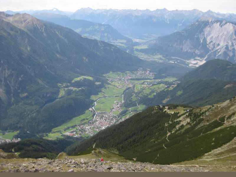 Über einen mit Erikapflanzen bewachsenen Aufstieg gewinnen wir wieder Höhe. Wir befinden uns nun hoch über dem Flauringer Tal. Wir erreichen den Rauen Kopf mit seiner Höhe von 2.308 Metern Höhe und machen eine kurze Gipfelrast. In der Ferne erkennen wir „den“ Berg der Deutschen mit seinem Skigebiet – die Zugspitze. Auf der anderen Seite blicken wir hinunter nach Innsbruck und erkennen sogar die Landebahn des Flughafens.