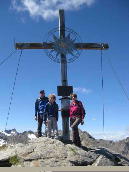 Als wir am Nachmittag gegen 14:30 Uhr wieder an der Hütte ankommen, werden wir schon von Heidrun, einem Mitglied der Holzmanntruppe, die auch in diesem Gebiet Urlaub macht, erwartet. Was für eine Riesenüberraschung. Heidrun konnte aufgrund konditioneller Probleme in diesem Jahr nicht an der gemeinsamen Bergtour teilnehmen verbringt aber einige Tage im Sellraintal. Naja – vielleicht gelingt es ja im nächsten Jahr wieder.