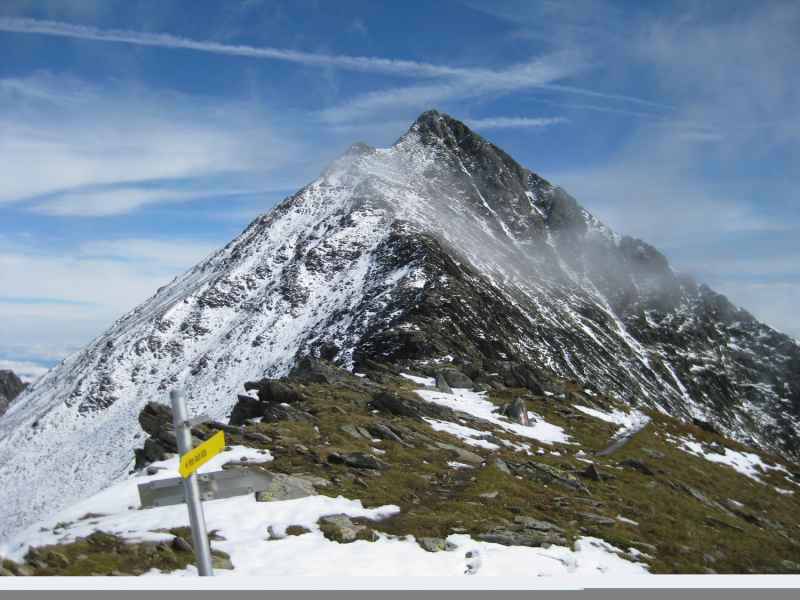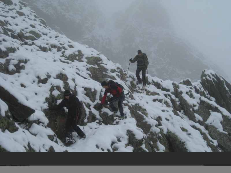 Die Bedingungen sind wirklich alles andere als gut. So fängt es schon nach kurzer Zeit wieder an zu schneien und die Sicht ist eigentlich gar keine. Zum Teil ist der Wind recht heftig und kühlt uns ziemlich aus. So ziehen wir schon nach kurzer Wegstrecke unsere warme Kleidung an. Die Wegmarkierungen sind zum Glück weitestgehend gut zu sehen. Über gesicherte Wegabschnitte geht es zügig hinauf. Vorsicht ist aber allemal geboten zumal der Schnee die Steine sehr rutschig macht. Wir müssen schon konzentriert darauf achten, wo wir jeweils den nächsten Schritt hinsetzen. Souverän führt Gila die Gruppe Schritt für Schritt dem Gipfel entgegen.