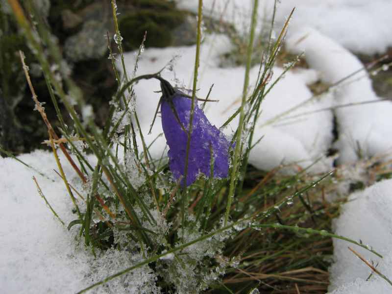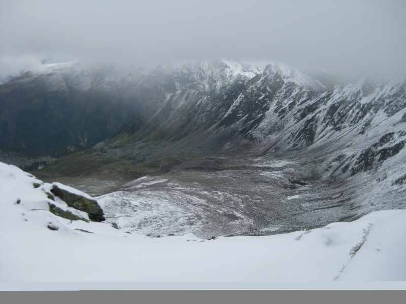 Die gestern von uns gewagte Wetterprognose bewahrheitet sich. Als wir die Vorhänge zurückziehen, stellen wir fest, dass es tatsächlich leicht schneit. Was ist denn nun mit dem Azorenhoch? Über Nacht ist die Schneefallgrenze auf 2.000 Meter gesunken. Dieser Tatbestand lässt uns unseren Plan ändern – denn eine Überschreitung der Hochreichscharte auf 2.912 Metern Höhe bei Schneetiefen von 20 cm ist wird bei diesen Bedingungen zu einem eher waghalsigen Unternehmen – zumal diese Etappe dich technisch anspruchsvollste der gesamten Runde sein soll.