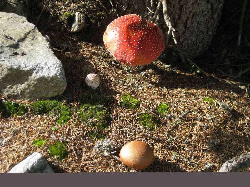 Nach einigen Metern hinab gelangen wir auf eine kleine Hochebene und folgen dann einem Teilstück des „Sellrainer Höhenweges“. In der Ferne hören wir Donnergrollen. Sollten wir auf den letzten Metern doch noch ein Wetter bekommen? Zügig geht es durch einen Wald hinab. Die Vielfalt an Pilzen scheint wieder grenzenlos.