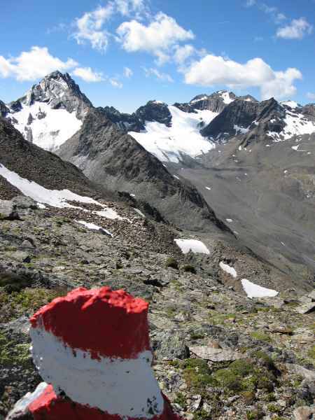 Gegen 8:00 Uhr verabschieden wir uns von Heidrun, Daniel und der Bielefelder Hütte. Der heutige Tag verspricht besseres Wetter. Das können wir auch gut gebrauchen, ist doch diese Etappe eine 9-Stundentour mit 1.200 Metern Auf-, 1.400 Metern Abstieg und einer Länge von gut 23 Kilometern. Zu Anfang führt der Weg durch das Ötztaler Skigebiet in dem in den Sommermonaten eine rege Bautätigkeit herrscht. In diesem Jahr wird ein großer Wasserspeicher für die Beschneiungsanlagen gebaut. So müssen wir zwischen den aufgeweichten, matschigen LKW-Spuren hin und her springen um einen einigermaßen trockenen Weg zu finden.