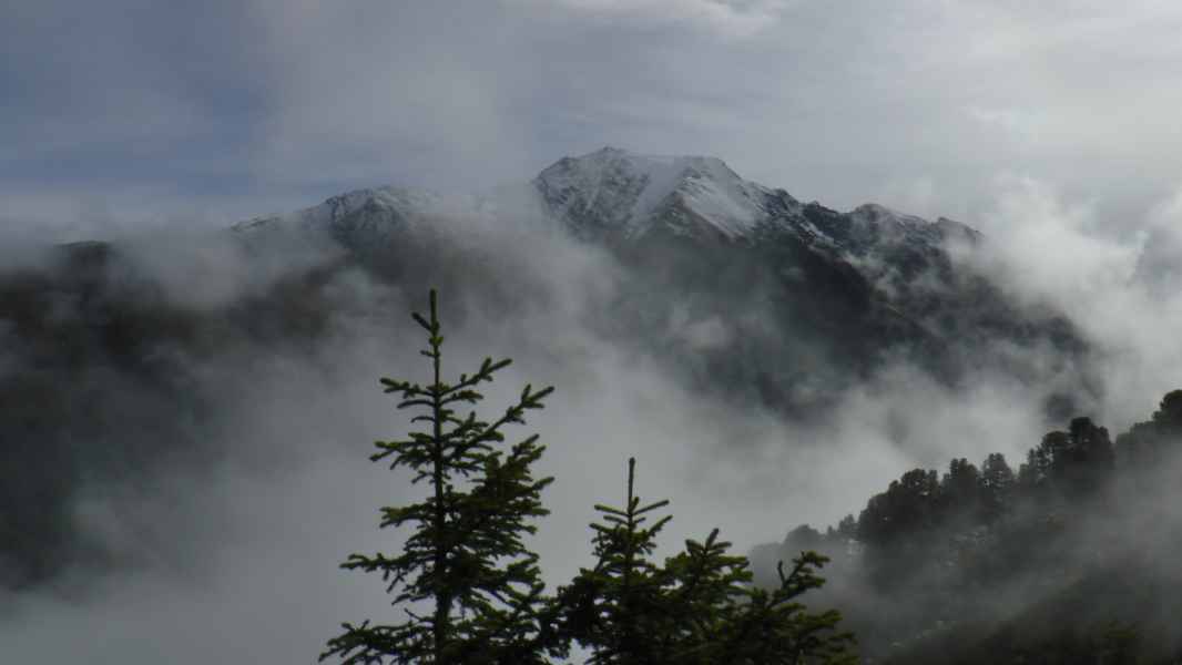 Vorbei an der Balbach-Alm gelangen wir endlich in schöneres Gelände. Durch einen Kiefer- und Zirbenwald führt unser Weg immer auf einer Höhe am Bergrücken entlang. Noch tut sich die Sonne schwer durch die dichte Wolkendecke hindurch zu dringen, aber das Wolkenspiel ist geheimnisvoll und beeindruckend.