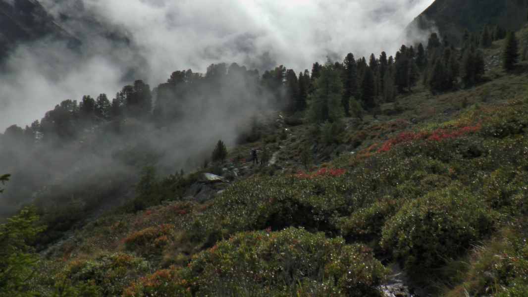 Auf einer Fahrstraße entlang des Hörlachbachs steigen wir ca. 500 Höhenmeter bei stetem Wechsel von Regen, Niesel und trockenen Passagen hinab ins Tal. In Niederthai fahren wir vorerst mit einem Kleinbus hinunter nach Umhausen und dann weiter nach Ötz.