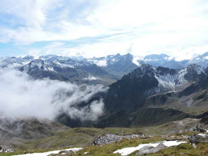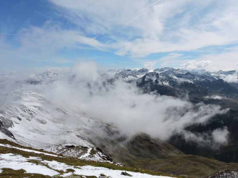 Gegen 11:00 Uhr erreichen wir den Gipfel des Roßkogel auf 2.647 Metern Höhe. Leider hüllen uns die Wolken ein und die Sicht ist mal wieder schlecht. Den in der Nähe liegenden Weißstein lassen wir aus und nehmen nun den direkten Weg hinab. Die Wolken werden langsam wieder dichter und es fängt manchmal sogar leicht an zu regnen.