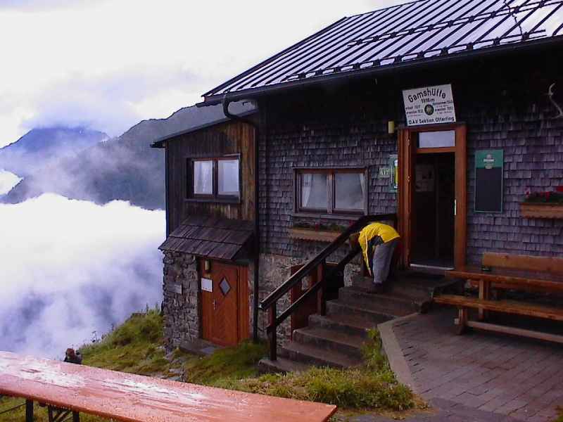 Nach langer Fahrt erreichen wir gegen 14.30 Uhr Mayerhofen und können unser Auto für 7.50 Euro im Zentrum für eine Woche stehen lassen. Um 15.30 Uhr bringt uns der Bus zur Almbahn nach Finkenberg. Wir beginnen gegen 16.00 Uhr unseren 1100 m hohen Aufstieg über den Herrmann-Hecht-Weg, der über viele Kehren durch den Wald an Höhe gewinnt und kommen gegen 18.45 Uhr auf der Gamshütte ( 1916 m) an. In der kleinen Gamshütte mit ca. 40 Schlafplätzen hat die Wirtin einen Raum für unsere Siebener- Gruppe reserviert, der in dieser ersten Nacht nur von uns beiden bewohnt wird. Zu unserer Stärkung trägt ein Schweinsbraten mit Kraut bzw. eine Kaspressknödelsuppe bei. Die Waschräume liegen hier außerhalb der Hütte, so dass man ein paar Schritte durch die frische Luft muss, um zu ihnen zu gelangen.