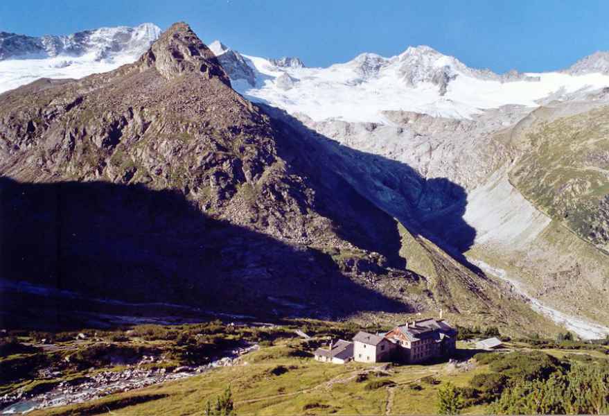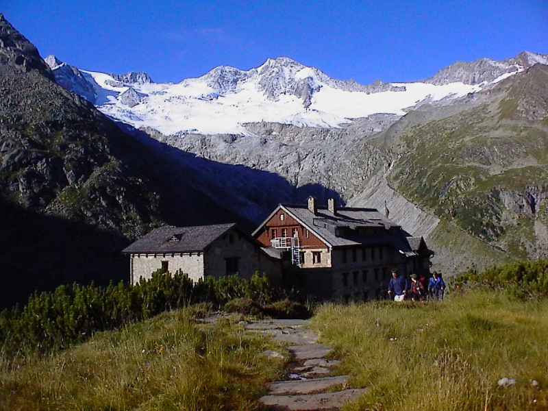 Von der Olperer Hütte steigen wir in einer Stunde ungefähr 600 Höhenmeter zum Schlegeisspeicher herab. Vorbei an schönen Alpenpflanzen wie Alpen-Geiskraut, Glockenblumen und Alpendost – der Schnee ist schon wieder entschwunden – führt der Weg in vielen Kehren hinab ins Tal. Nach einigen Tücken, die Bushaltestelle, an der wir warten, existiert als solche nicht, fahren wir wiederum Bus. Diesmal bringt er uns zum Breitlahner auf ca. 1200 m Höhe, von wo aus wir unseren Aufstieg zur Berliner Hütte bei Sonnenschein beginnen. 960 Höhenmeter gilt es, zu bewältigen. Der Weg selbst hat keine Schwierigkeiten, überwiegend ein breiter Fahrweg, jedoch sehen wir an einem steilen Hang unser erstes Edelweiß in freier Natur. Die Blicke sind phantastisch, das Waxeckkees, die gut sichtbaren Seitenmoränen – Erdgeschichte zum Anfassen. Nach drei Stunden haben wir die Hütte auf 2040 m Höhe erreicht. Die Berliner Hütte ist eine Hütte der Superlative – das Grand Hotel der Zillertaler, um die Worte von Franz Stock zu benutzen. 1879 errichtet wurde die ursprünglich kleine Hütte durch zahlreiche An- und Ausbauten zu einer der größten Hütten im Alpenraum (ca. 200 Schlafplätze). Dass sich zur damaligen Zeit die „Hauptstadtsektion“ angemessen präsentieren wollte, zeigen der gewaltige Speisesaal und das Haupttreppenhaus. Als einzige Hütte des DAV steht die Berliner Hütte unter Denkmalschutz. Wir sind im Winterraum untergebracht und genießen eine Dusche. Danach schmeckt der Germknödel nochmal so gut, den wir auf der Sonnenterrasse genießen.