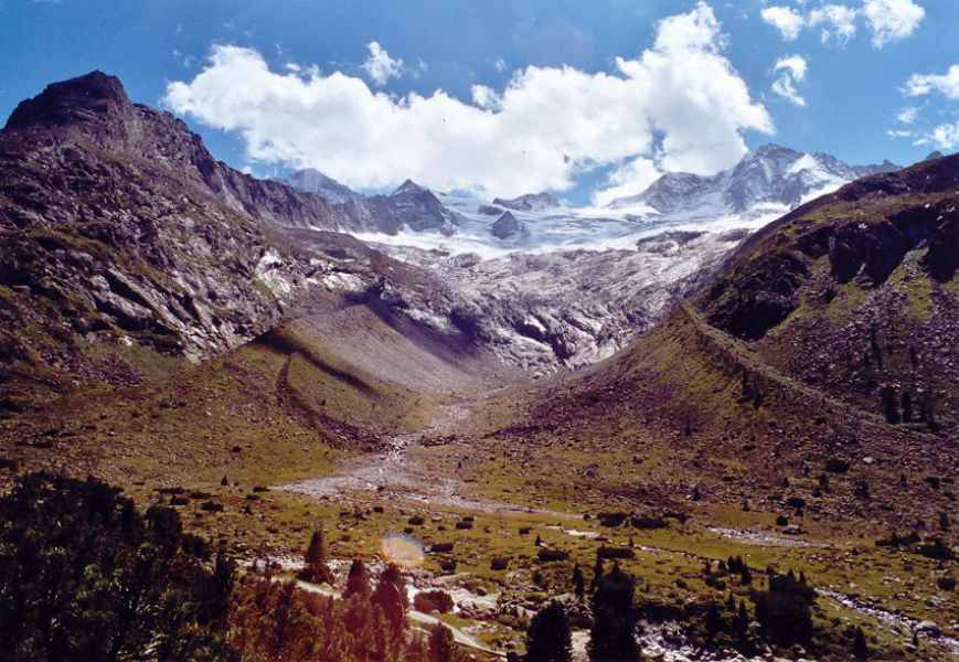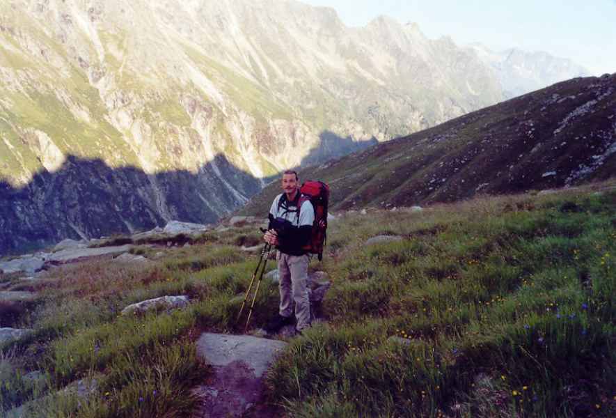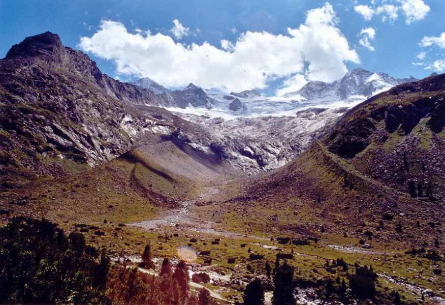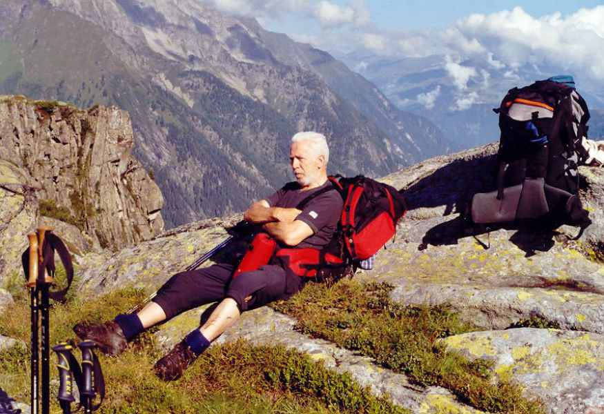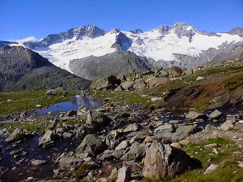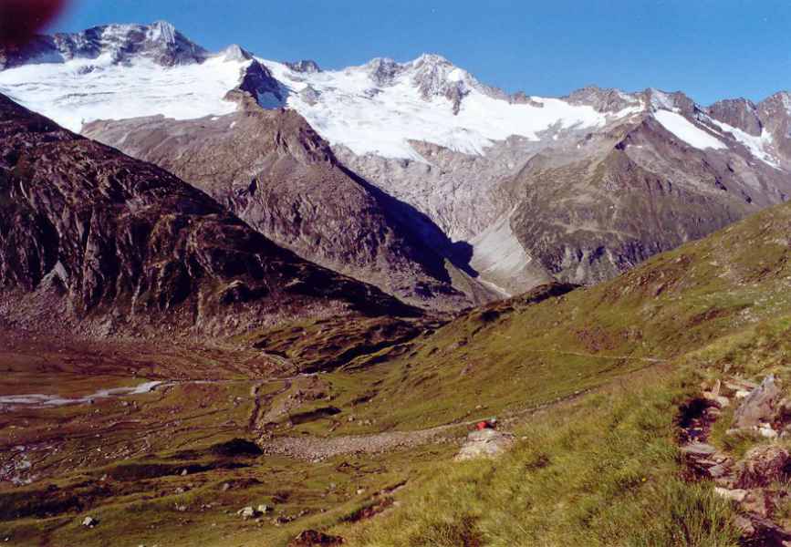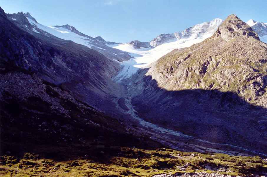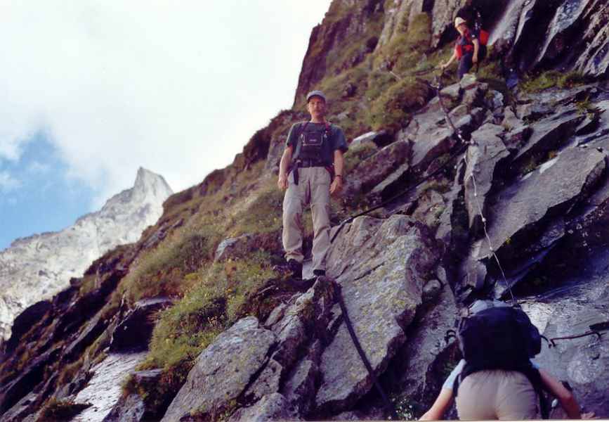 Heute machen wir uns gegen 8.00 Uhr auf den Weg. Unser Tagesziel ist die Kasseler Hütte. Der Tag verspricht wieder sehr schön zu werden. Der Himmel ist blau, aber wir können unsere Wanderung im Schatten beginnen. Zunächst verläuft der Weg südöstlich ansteigend, zuletzt in vielen Kehren hinauf in die Lapenscharte (2700 m). Wir machen eine kurze Pause hier in der Scharte und Heinrich findet sogar eine Stempelstelle für Höhenwege vor. Jenseits der Scharte steigen wir zunächst in einem weit ausholenden Bogen, dann in Kehren hinab ins Lapenkar bis ca. 2250 m. Hier machen wir eine ausgiebige Rast in der warmen Sonne, essen, liegen, genießen. Dann geht es in einem weit nach Süden ausholenden Bogen durch den Torschluss des Stillupgrundes am nahen Gletscher vorbei. Es ist beeindruckend, mit welcher Kraft der ehemals wesentlich größere Gletscher den Untergrund geformt hat. Auf dem weiteren Weg zur Hütte, der ohne große Auf- und Abstiege verläuft, stürzt Manfred auf einer glatten nassen Felsplatte auf die rechte Schulter. Gegen 14.30 Uhr erreichen wir die Kasseler Hütte (2177 m), sitzen zunächst noch in der Sonne, füllen unsere Flüssigkeitsreserven auf und genießen einen Apfel- bzw. Topfenstrudel. Durch Arbeiten an der Wasserversorgung kommt es vorübergehend zu einem Engpass. Waschraum/Toilettenbenutzung sind tabu und auch in der Küche gibt es kein Wasser mehr. Irgendwann jedoch sind die Probleme behoben und nach einer Wäsche (allerdings ohne das sonst hier mögliche warme Wasser) genießen wir das Abendessen. Inzwischen haben sich Wolken vor die Sonne geschoben und es regnet. Es wird über den möglichen Weg und das Wetter für den morgigen Tag diskutiert.