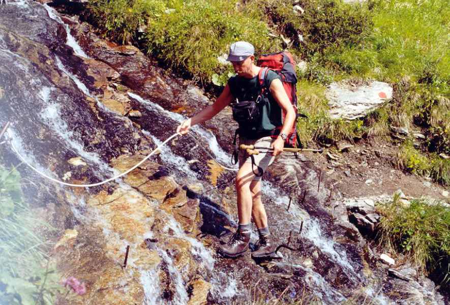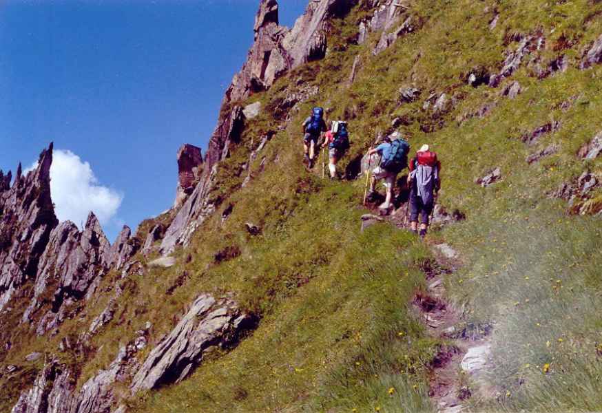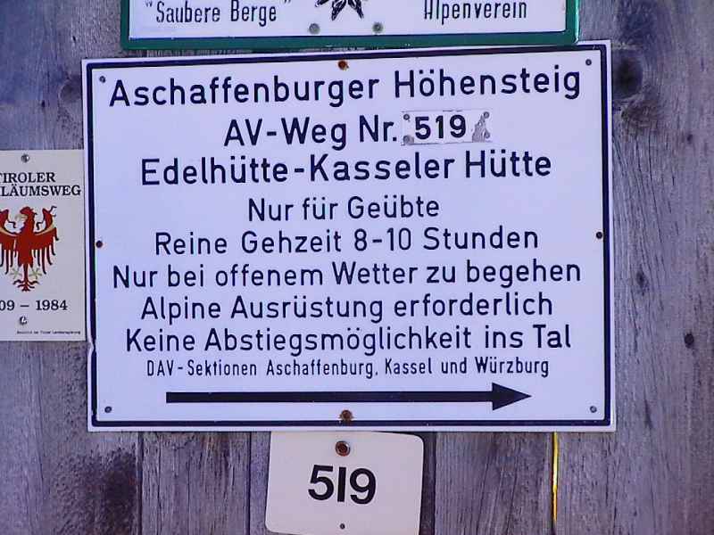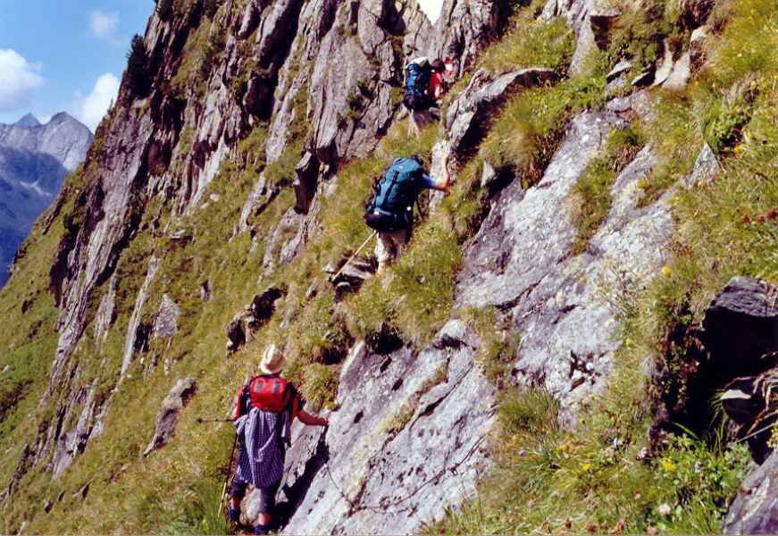 6.00 Uhr aufstehen. Die Sorgen waren unbegründet. Der Himmel sieht vielversprechend aus und wir starten um 7.15 Uhr auf dem unteren, weil neuerem Weg zur Edelhütte. Wir gehen oberhalb des Stillupgrundes den „Siebenschneidenweg“ oder auch „Aschaffenburger Höhensteig“. Der Weg verläuft über 14 km von Schneide zu Schneide recht abwechslungsreich. Grobe Felsblöcke wechseln mit Drahtseilversicherungen oder sanften Graswegen. Außerdem bekommen wir die Gelegenheit Gemsen zu sehen und im Bereich der Krummschnabelschneide können wir mehrere Murmeltiere beobachten bzw. sie uns. Ihr warnendes Pfeifen ist immer wieder zu vernehmen, mal weiter entfernt, ein anderes Mal ganz in unserer Nähe. Dann am Popbergnieder liegt sie vor uns – die Edelhütte. Eine letze Seilversicherung, ein wenig Geröll und hinunter geht es zur nahen Hütte, die auf 2.238 Meter Höhe liegt. Wir kommen um 16.30 Uhr an und genießen das schöne, warme, sonnige Wetter noch ein wenig draußen. Hinter uns liegt eine Etappe mit einer Dauer von 9.5 Stunden. An der Hütte leisten uns Ziegen, Hühner und auch Hafflinger Gesellschaft.