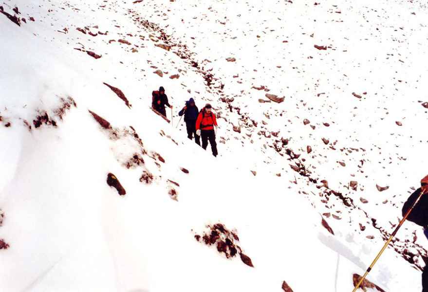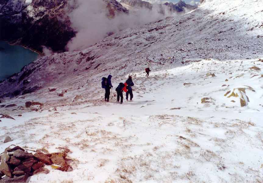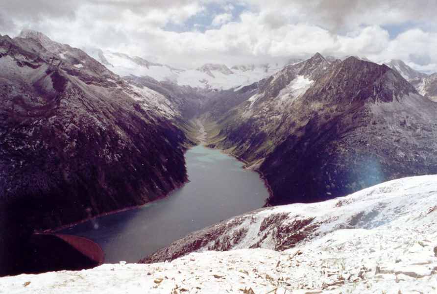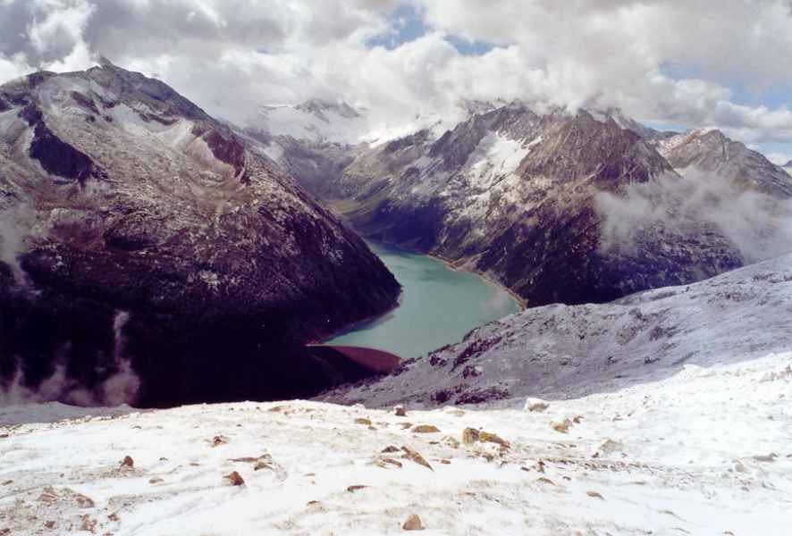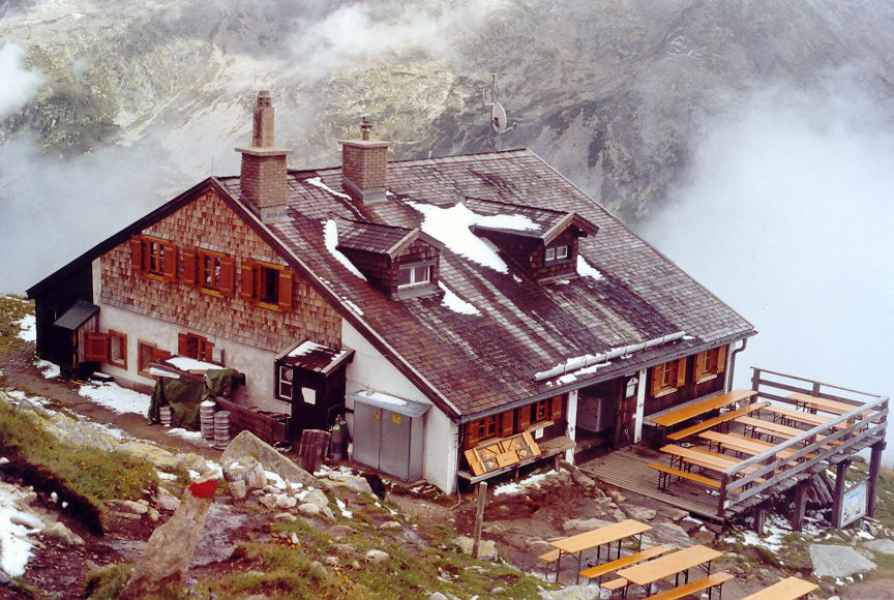 Unsere Planung für diesen Tag sieht den Weg von der Gamshütte zum Friesenberghaus, einen langen Übergang von ca. 14 km Länge vor. Leider regnet es jedoch in Strömen und auf Nachfrage erzählt uns Johann, der Wirt, dass die Schneefallgrenze laut Ankündigung auf 1600 m sinken soll, er rät von dieser Etappe ab. So steigen wir um 8.15 Uhr im Regen in etwa zwei Stunden nach Finkenberg ab, fahren mit den Autos nach Ginzling und wärmen uns dort bei Speckknödelsuppe im Gasthaus auf. Danach fahren wir mit dem Bus zum Schlegeisspeicher auf 1800 m Höhe und erreichen nach 2 Stunden Gehzeit gegen 15.00 Uhr bei Regen, der später in Schnee übergeht, das Friesenberghaus auf 2500 m Höhe. An diesem Abend bringt uns Heinrich das Doppelkopfspielen bei, bis wir schließlich eiskalte Schlafräume (8 Grad Celsius im Raum von Harry, Heinrich und Manfred; bei uns dürfte es durch die Außenwand noch etwas weniger sein) aufsuchen.