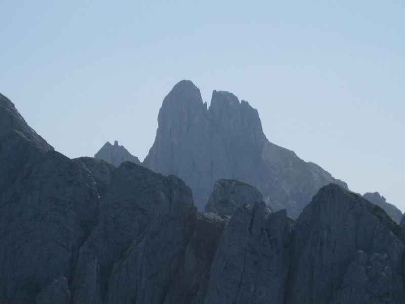 Etwas zu spät, wir wollen noch auf Annette warten die es gestern nicht mehr geschafft hat zur Hütte aufzusteigen und daher im Auto geschlafen hat, machen wir uns auf in Richtung Ramsauer Klettersteig oder eventuell auch die Scheichenspitze. Aus beidem wird nichts, denn der Wind ist einfach schon zu stark. Heftige Böen und die drohenden dunklen Wolken verhindern unsere Pläne. So machen wir nur eine kleine Wanderung um den Eselstein herum. Einige Gruppenmitglieder besteigen noch den Sinabel mit einer Höhe von 2.340 Metern