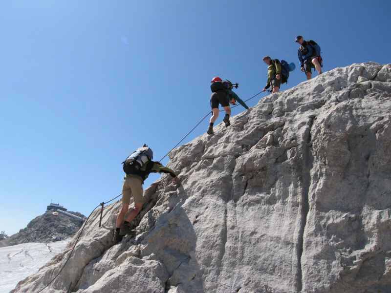 Die Sicht lässt zu wünschen übrig aber zum Klettern benötigt man diese ja nicht unbedingt. Schöne Kletterpassagen die mit Konzentration gegangen werden erwarten uns. Oben auf dem Schöberl treffen wir eine Gruppe des DAV-Summit-Klubs die zu Ausbildungszwecken hier hinauf gestiegen ist. Nun geht es über den Rücken des Schöberl wieder hinunter zum Fuß des Berges.