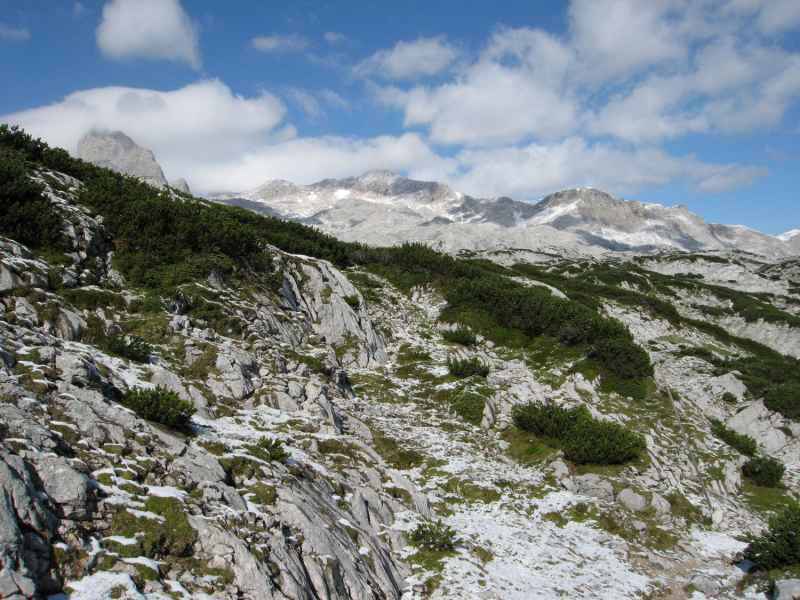Die Bewölkung lässt immer mehr nach und es dauert gar nicht lange und wir wandern wieder unter einem blauen wolkenlosen Himmel mit hellem Sonnenschein. Es geht nun über das weite Karstgebiet das wir schon vom Hohen Gjaidstein aus gesehen haben. Der Weg ist leicht vom Schnee bedeckt und die Markierungen sind nicht immer leicht auszumachen. Wir orientieren uns an den Stangen die die Skiroute anzeigen. Diese sind immer schon auf einiger Entfernung zu sehen. Zwischen weiträumigen Latschenfeldern führt unser Weg.