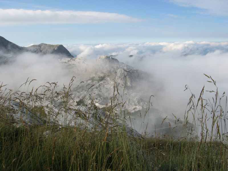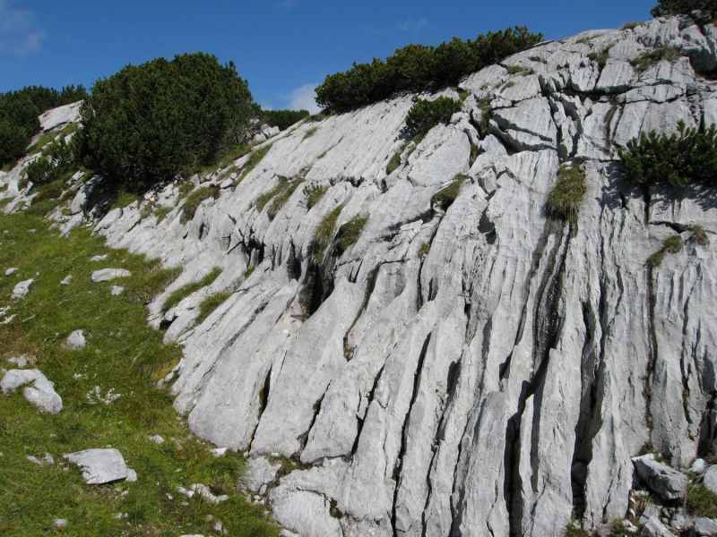 Nach kurzem Aufstieg erreichen wir den Hohen Trog auf 2.354 Metern Höhe um dann auch gleich wieder hinab in Richtung Hoßkogel abzusteigen. Wohin man auch sieht, überall finden wir nun Megalodonten, versteinerte Zeugnisse längst vergangener Zeiten. Die bekanntesten Vertreter dieser Gruppe sind die sogenannten Hirsch- oder Kuhtrittmuscheln aus der Trias, die heute als Fossilien wir hier im Dachsteinkalk und ähnlichen Gesteinen der nördlichen Kalkalpen zu finden sind.