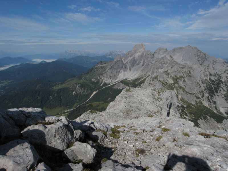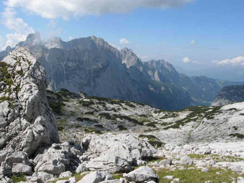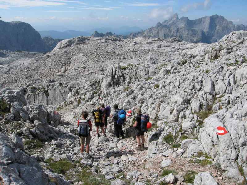 Am Ende des Schigebiets beginnt nun das große Karstgebiet, das wir vom Gipfel des Hohen Gjaidsteins ja schon ausmachen konnten. Der Weg zieht sich ziemlich und die sehr hohen Temperaturen machen uns in diesem Gelände zu schaffen. Wir müssen mit dem Trinkwasser haushalten denn eine Auffüllstation gibt es hier weit und breit nicht.
