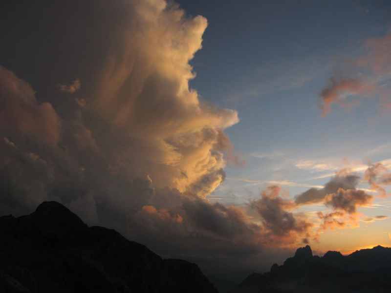 Noch während wir dem Sonnenuntergang zusehen, kommen Kletterer aus den Routen an der Hütte vorbei und machen sich noch auf den Weg zurück zum in der Nähe gelegenen Parkplatz der Liftstation. Wir genießen einen herrlichen Sonnenuntergang bei sehr angenehmen warmen Temperaturen auf der Hüttenterrasse – ein Umstand, der auf unseren Hüttentouren der letzten Jahre fast noch nie vorgekommen ist.