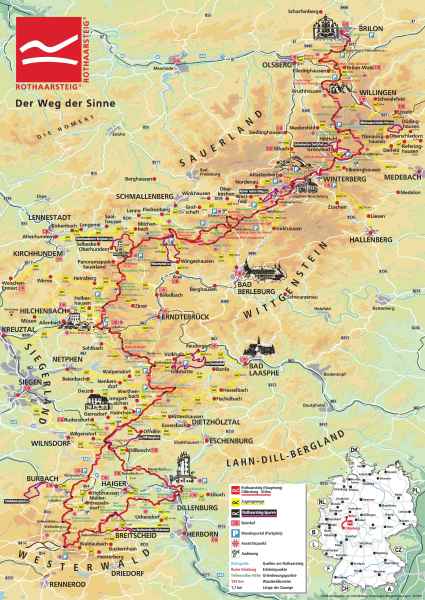 Flaggschiff aller Wanderwege des Sauerlandes und der Region Siegen-Wittgenstein ist der Rothaarsteig, der als einer der schönsten Höhenwege in Europa gilt. Der 154 Kilometer lange "Weg der Sinne", der über eine Vielzahl naturnaher Wege, über Pfade und Waldwirtschaftswege führt, beginnt in Brilon und endet im hessischen Dillenburg.