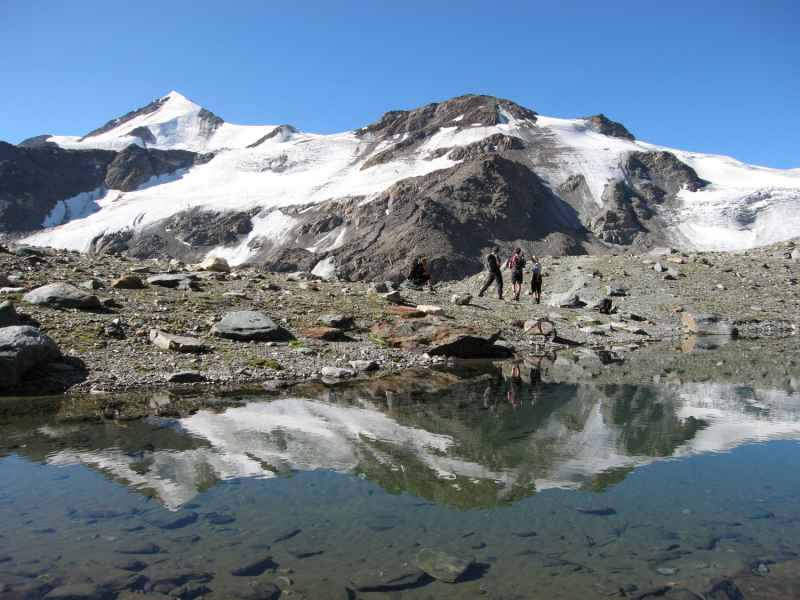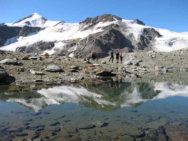 Nach diesen schönen Augenblicken verlassen wir die Eisseespitze und machen uns auf einer etwas abgeänderten Route auf den Heimweg zur Hütte. An dem vom Aufstieg schon bekannten klaren Bergsee in 2.825 Metern Höhe machen wir noch einmal Rast, baden die Füße im kristallklaren jedoch eiskalten Wasser und lassen uns von den wärmenden Sonnenstrahlen verwöhnen.