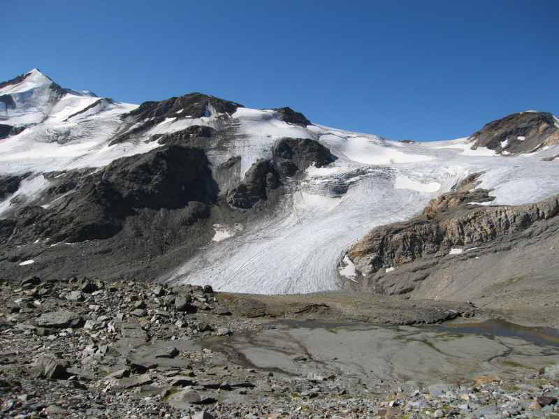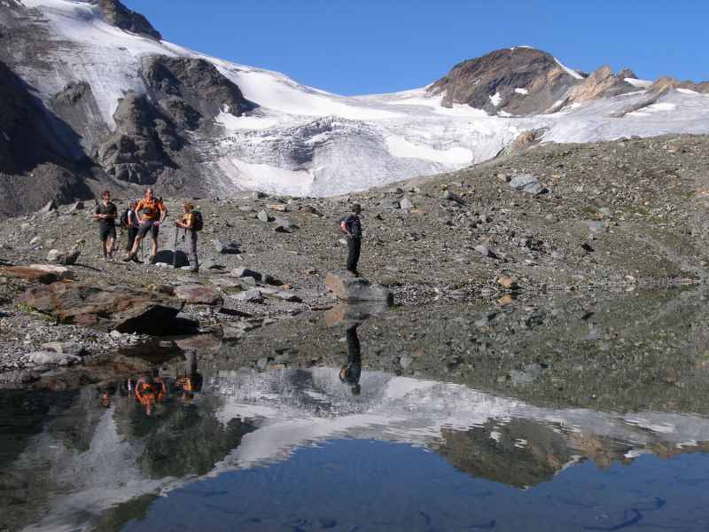 Am Gletscherfuß suchen wir uns wieder ein windstilles Pausenplätzchen. Die Seen von heute Morgen locken mit ihrem Anblick. Allerdings nicht zum Baden sondern zum Betrachten und verweilen. Der Rückweg führt uns wieder über die Marteller-Hütte auf der wir einkehren und ein letztes Mal deren Gastfreundschaft genießen ehe wir wieder zur Zufallhütte absteigen.