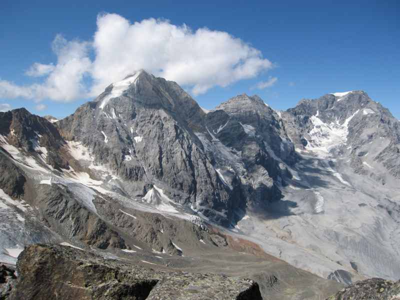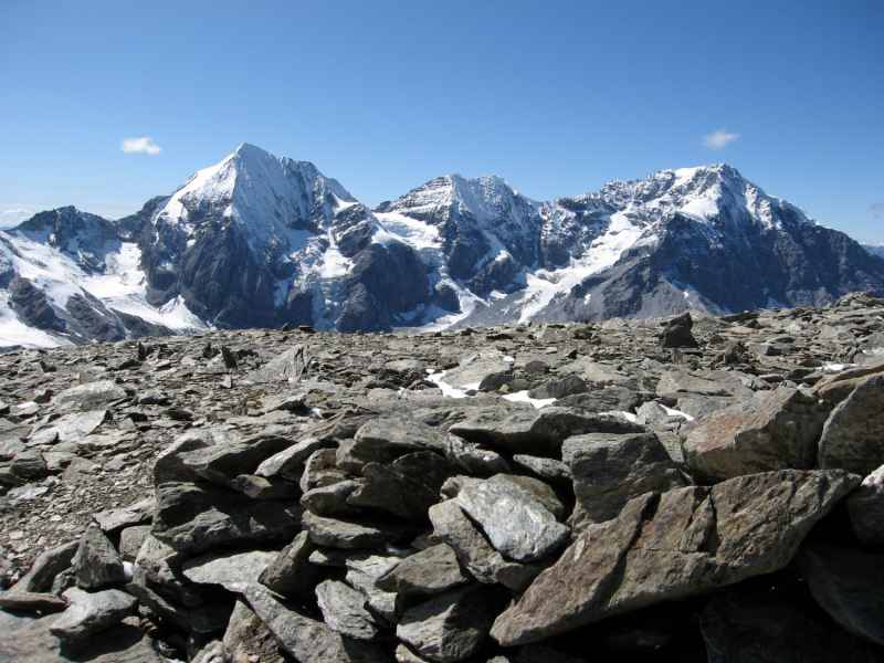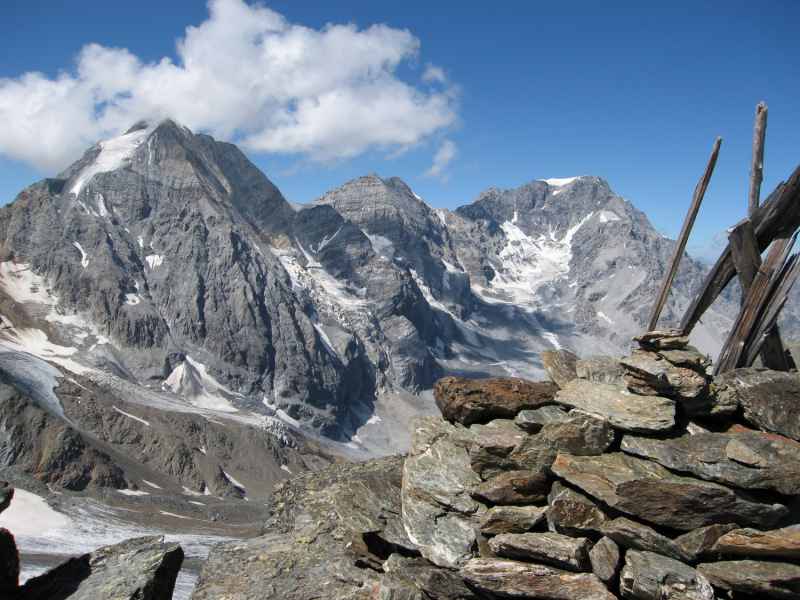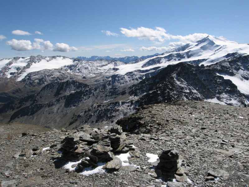 Ab dem Joch ist es ein einfacher Anstieg in Kehren über Schotter und kleineres Gestein, den viele Wanderer gehen. Um dem heftigen und kalten Wind auszuweichen, suchen wir hinter einer kleinen Steinmauer Schutz. Hier können wir in der wärmenden Sonne die Bergwelt gemütlich bewundern. Am Gipfel erwartet uns wirklich eine phantastische Aussicht auf die Berge des Ortlermassivs oder wie sie auch genannt werden - die Ortleralpen.