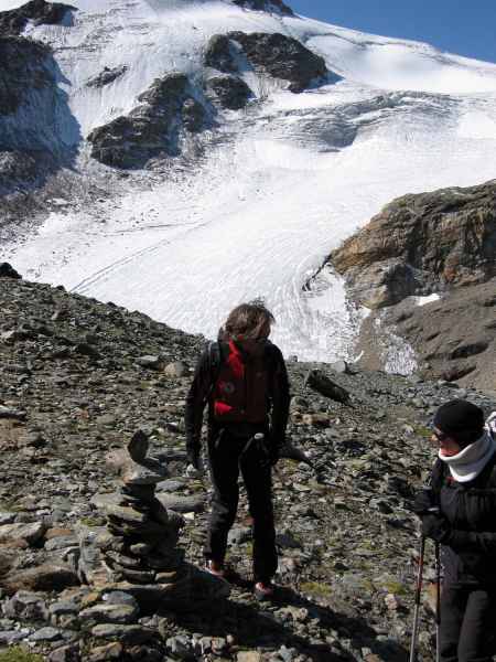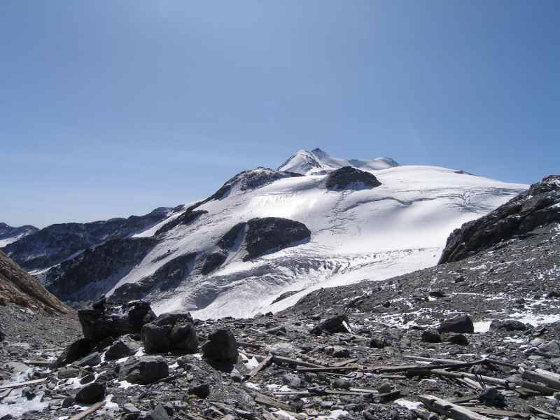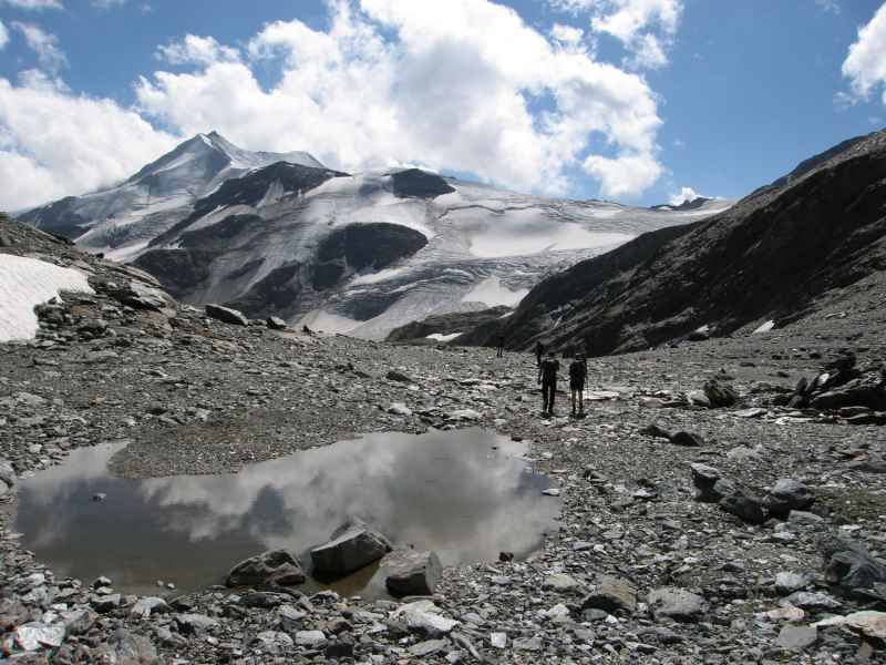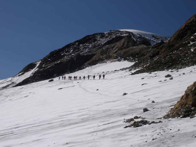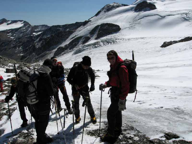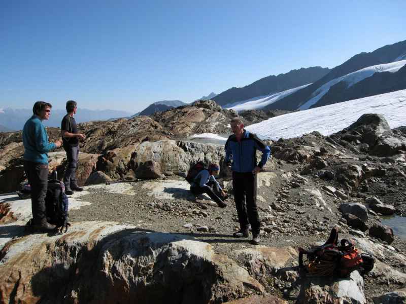 Nach den Erlebnissen und Erfahrungen der letzten Tage wollen wir heute eigenständig einen Gletscher überqueren. Wir wollen die Cima Marmotta oder auch Köllkuppe, wie sie mit deutschem Namen heißt, besteigen. Den uns schon bekannten Weg zur Martellerhütte bewältigen wir im Schatten der Berge.