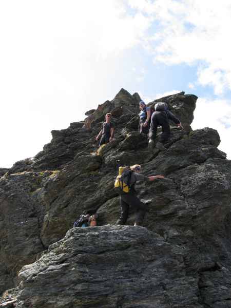 Auf diesem Weg begegnen wir zum ersten Mal den „Gelbkappen“, eine Männertour aus Deutschland, die uns die nächsten Tage noch einige Male über den Weg laufen werden. „Gelbkappen“ nennen wir sie, da alle als Erkennungszeichen eine gelbe Baseballkappe mit Werbeaufschrift eines Campingplatzes in Ostdeutschland tragen. So sind sie immer schon auf einiger Entfernung zu erkennen. Schlüsselstelle dieser Kletterei ist der Einstieg. Wenn hier nicht die richtige Stelle erkannt wird, dann ist die Klettertour schon zu Ende bzw. kann sie richtig ungemütlich werden. So geben zwei der sechs „Gelbkappen“ schon am Einstieg auf. Wir jedoch finden Dank Wolfgang den richtigen Weg und wir bewegen uns im 1. und 2. Klettergrad was allen viel Spaß macht. Der Weg erfordert einige Konzentration, da ein paar Stellen ziemlich ausgesetzt sind.