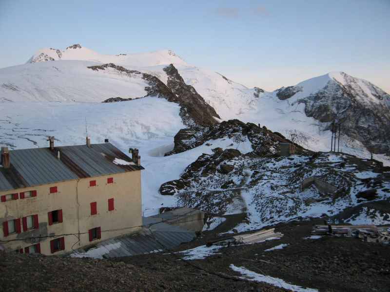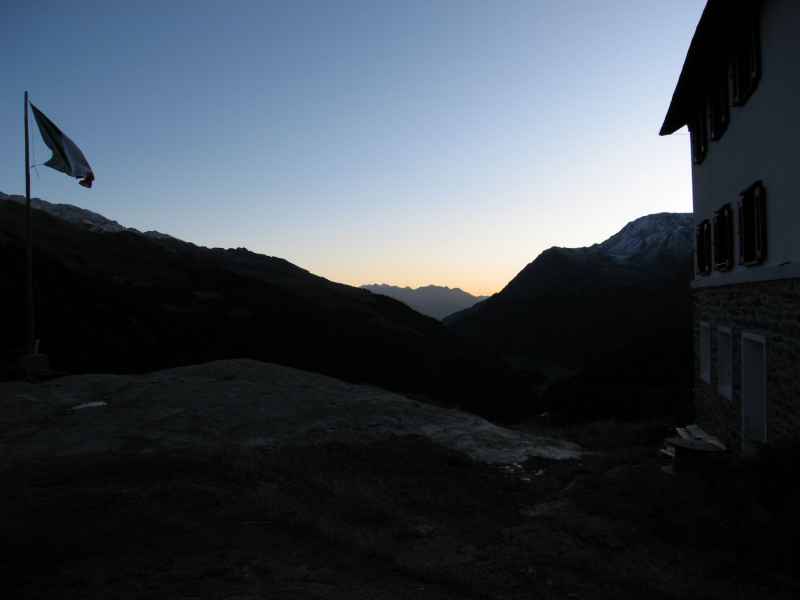 Wieder zurück an der Hütte genießen wir noch die Nachmittagssonne auf der Hüttenterrasse. Unser Zimmer, das ein wenig klamm ist, haben wir für uns alleine. Die Verpflegung lässt jedoch trotz der 49 Euro teuren Halbpension zu wünschen übrig. Nach dem Abendessen erleben wir noch einen Sonnenuntergang wie man ihn wohl nur in den Bergen beobachten kann. Schön leuchten die uns umgebenden Berge im verblassenden Sonnenlicht.