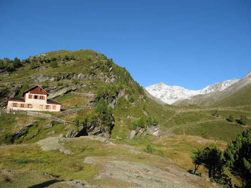 Für die diesjährige gemeinsame Bergtour haben wir uns zu Standorttouren im Bereich der Zufallhütte im Martelltal in Südtirol entschlossen. Wir, das sind Annette und Wolfgang, Andrea und Heidrun, David, Dagmar und ich. Zu siebent wollen wir elf Tage lang die Marteller Berge erobern. Die Zufallhütte, unsere Unterkunft für die nächsten Tage, liegt im Abschluss des Martelltals auf einer Höhe von 2.264 Metern. Alle sind schon am Vortag auf der Hütte angekommen. Heidrun wurde von Ihren Eltern, Liselotte und Gerd Hansen, von denen wir uns heute schon verabschieden, hinauf begleitet. Es hat schon eine gewisse Tradition, dass die Beiden uns zu einem Zeitpunkt während der Touren der letzten Jahre besuchen.
