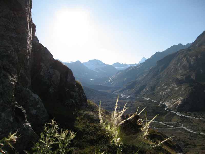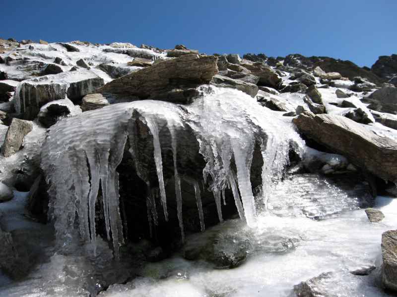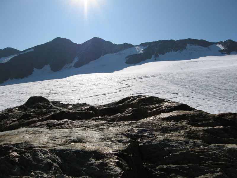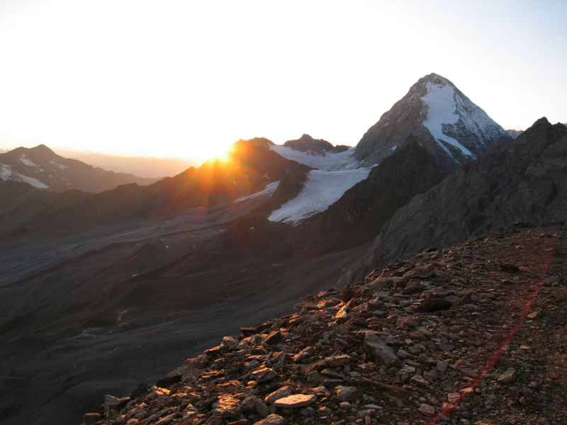 Langsam aber stetig steigen wir im Tal des Langenferners in Richtung Eisseepass auf. Die Temperaturen sind immer noch sehr niedrig. Hier und da ist der Fels noch mit Eis überzogen, das jedoch in der aufsteigenden Sonne anfängt zu schmelzen. Hubert geht mit einem sehr konstanten Schritt und Minute um Minute gewinnen wir an Höhe. Die Nächte sind in dieser Höhe immer sehr kalt. Aber noch schafft es die Sonne, mit ihren wärmenden Strahlen die erstarrte Welt langsam aufzutauen.