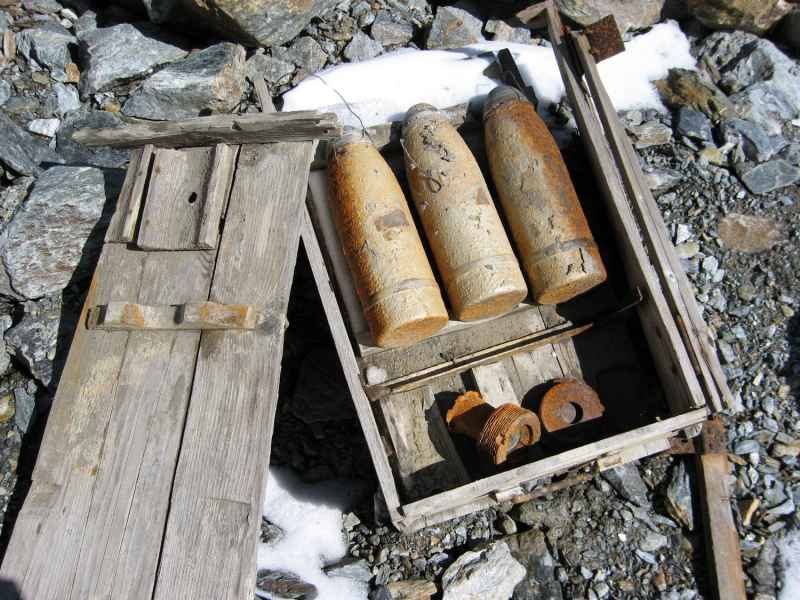 Nach dieser Pause nehmen wir wieder unsere Rucksäcke auf und streben zum sogenannten Inneren Kofel am Cevedalepass entgegen. Dieser Ort ist in der Karte mit „3 Kanonen“ bezeichnet. Der Platz heißt so weil hier drei Kanonenrohre aus dem 1. Weltkrieg liegen. Bei den Kanonen handelt es sich um italienische 149 - G Geschütze vom Hersteller Arsenale in Turin. Jedes Rohr hat ein Gewicht von ca. 3,3 Tonnen und hatte eine Reichweite von über 10 Kilometern. Man stelle sich nur die Mühen und Strapazen vor, diese Kanonen hier herauf zu schaffen.