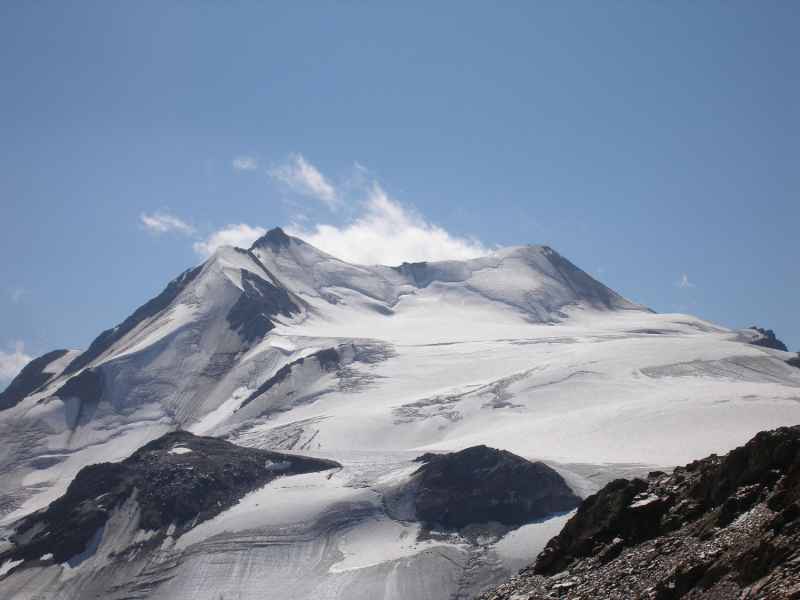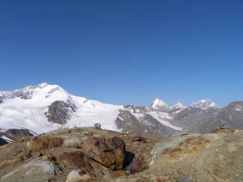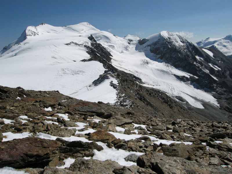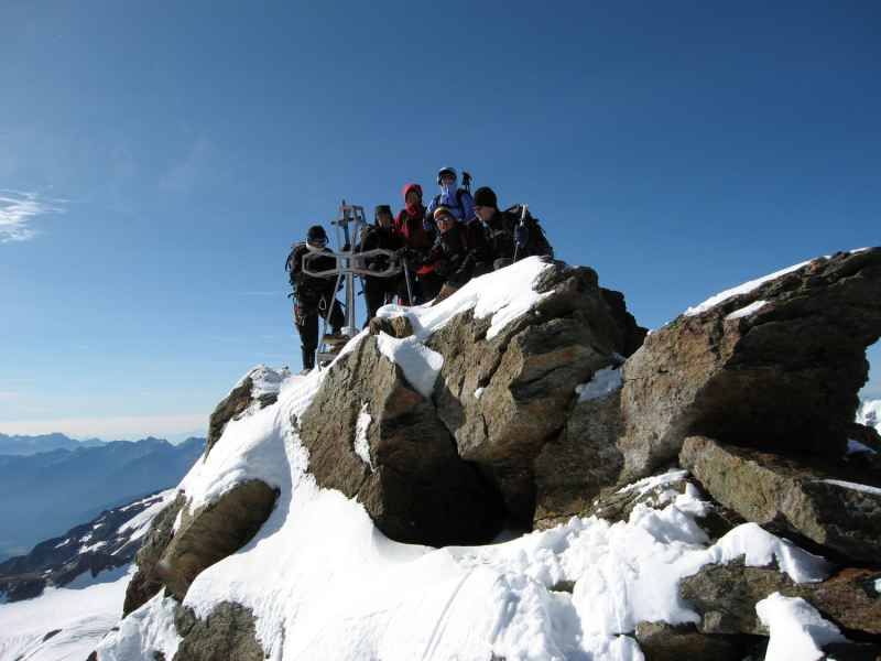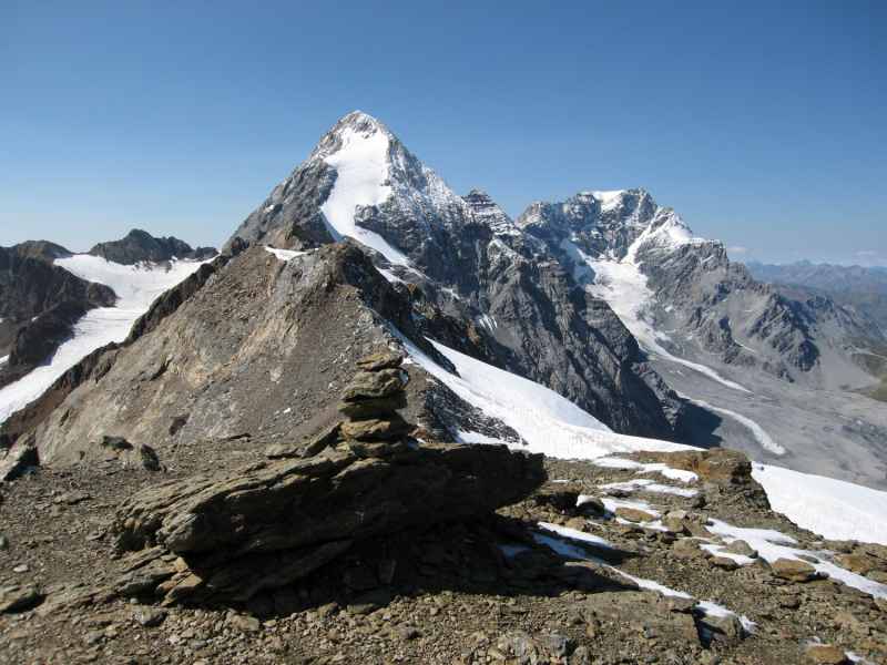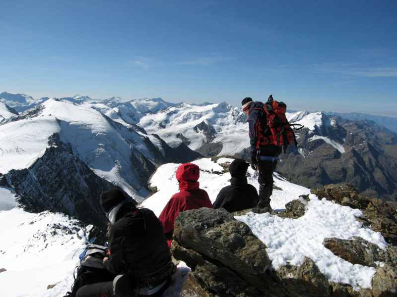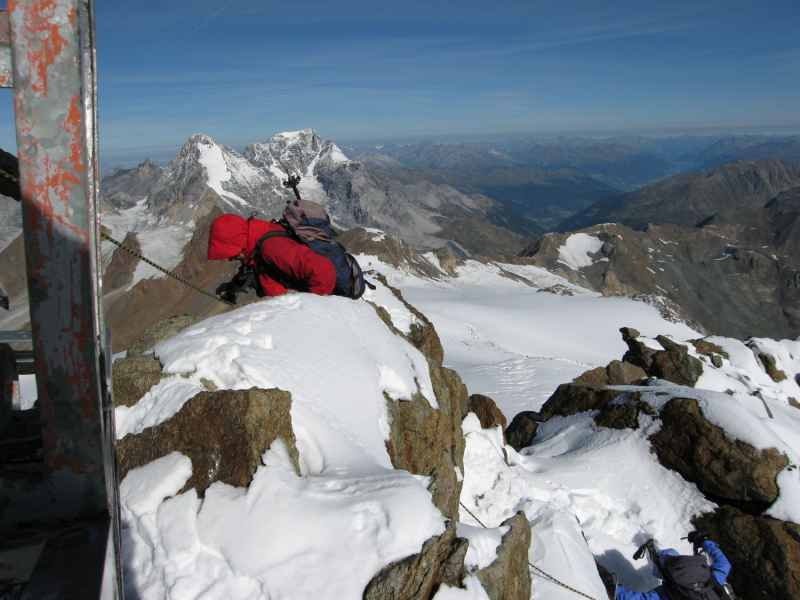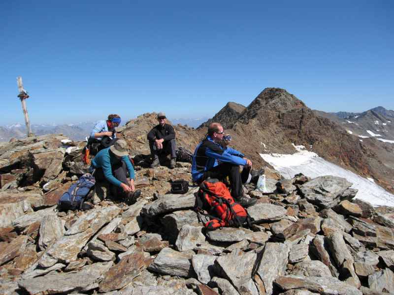 Am Gipfel machen wir eine ausgiebige Rast und genießen die Ruhe, das schöne Wetter und den prächtigen Blick auf die Zufallspitzen und den Monte Cevedale. Auf der anderen Seite haben wir freien Blick auf den Zebrú und auf den Ortler, dem höchsten Berg Südtirols. Etwas weiter links schauen wir auf die Königspitze oder auch Gran Zebrú wie er in Italien genannt wird. Wenn das Wetter mitspielt, werden wir den Monte Cevedale, den dritthöchsten Gipfel der Ortleralpen in den nächsten Tagen besteigen. Hierzu hat Wolfgang schon mit Hubert Wegmann, einem Bergführer der Alpinschule Sulden, Kontakt aufgenommen. In der Ferne erkennen wir die Casatihütte, den Ausgangspunkt für unsere Cevedale-Besteigung.
