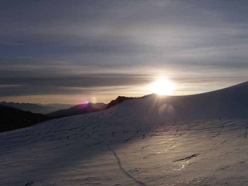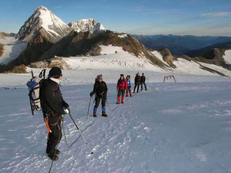 Um 6:30 brechen wir von der Casati-Hütte auf. Heute gehen wir von Anfang an in Seilschaft, da der Gletscher einige Spalten hat. Der Monte Cevedale mit seiner Höhe von 3.778 ist nach Ortler und Königspitze der dritthöchste Berg des Ortlermassivs und der höchste Berg des Trentinos. Ihm nordöstlich vorgelagert sind die Südliche Zufallspitze und die nördliche Zufallspitze mit jeweils 3.757 Metern und 3.700 Metern Höhe. Die Südliche Zufallspitze markiert das Dreiländereck der italienischen Provinzen Trentino, Südtirol und Sondrio.