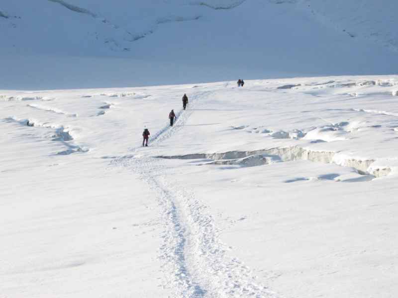 Wir legen unsere Gletscher-Ausrüstung an und Wolfgang bindet die Achterknoten in das Seil. Es ist tatsächlich für jeden ein Knoten vorhanden. Die überschüssigen Seilenden verstauen Wolfgang und ich in unseren Rucksäcken ehe wir uns auf den Weg machen. Wir haben Glück und können eine bereits bestehende Spur nutzen. Im strahlenden Sonnenschein gewinnen wir langsam an Höhe. Dieses erste Teilstück des Gletschers ist eher flach.
